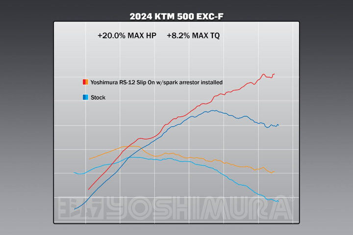 Power increases were massive with this one! The KTM500 EXC-F responded to our RS-12 Enduro Series Slip-on like a dream, adding 20% max HP and 8.2% max ft-lb of torque. These are extraordinary numbers for a slip-on exhaust system, and theyre achieved even with the pre-installed spark arrestor!