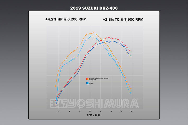 Suzuki DR-Z 400 S/SM have been a staple of the street and super moto enthusiast for quite a long time. The RS-2 equipped with updated muffler branding and installed spark arrester,  delivers all the power you'd expect from Yoshimura. Our dyno indicated a 4.2% increase in max HP and 9% max torque, it's no wonder this is the go to system for the popular DR-Z.