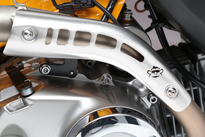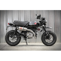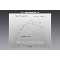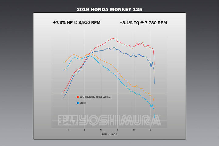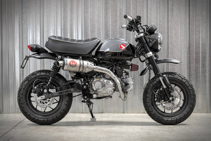 For Yoshimura, getting the details right on the Monkey was critical. Sure we added performance. Our full system max HP is up 7.3% as well as max torque being up 3.1%, but the sound had to be fitting for the new two-wheeled primate - enter the custom developed pint-sized RS-3. With an included a high temperature ceramic coated end cap featuring a titanium tip, a special inner core baffle, and an integrated heat shield, this little guy delivers style, performance, tone and fun! Our Race Series full system even includes an 18mm O2 sensor bung installed. It's all about the details on this new system for the new Monkey!