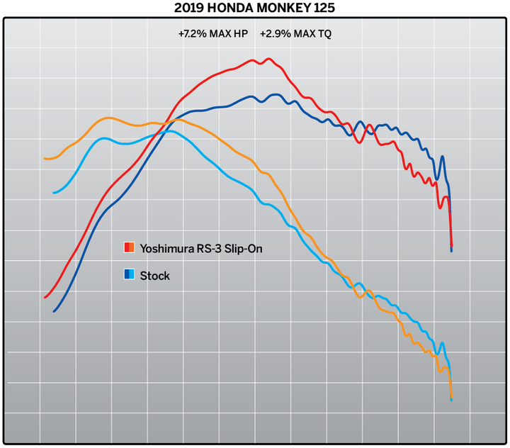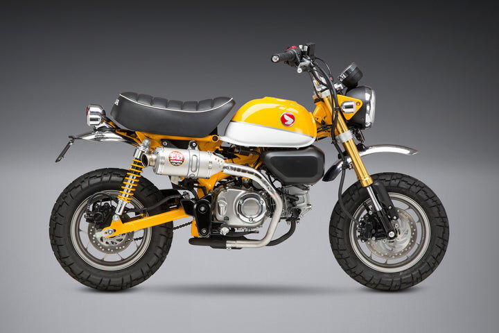 For Yoshimura, getting the details right on the Monkey was critical. Sure we added performance. Our Slip-On system max HP is up 7.2% as well as max torque being up 2.9%, but the sound had to be fitting for the new two-wheeled primate - enter the custom developed pint-sized RS-3. With a custom a high temperature ceramic coated end-cap featuring a titanium tip, a special inner core baffle, and an integrated heat shield, this little guy delivers style, performance, tone and fun! It's all about the details on this new system for the new Monkey!