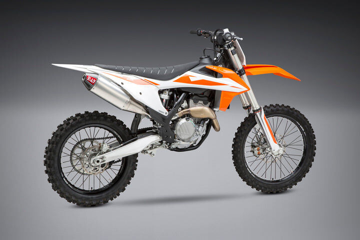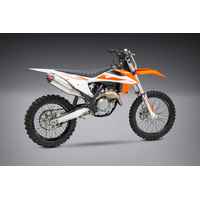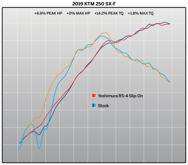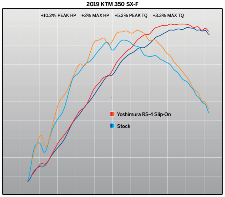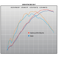 We wound up with the 250 peak HP at 6.6% and a big gain of peak torque of 14.2% The 350 was even more impressive with a peak HP gain of 10.2% and peak torque gain of 7%. The work horse for much of this performance is our RS-4 muffler. With its Poly-resonant Duplex front chamber to add overall volume, and the special stepped two-stage baffle configuration that reduces sound without restricting performance. These Austrian 250 and 350 race machines are ready for the top of the podium now! Spark arrester available separately.