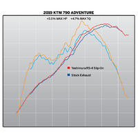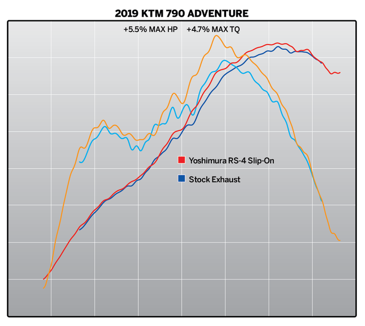 We started off by developing our Works Finish RS-4 muffler profile to compliment power delivery. This new KTM responded to our design even more than we had hoped, increasing 5.5% in max HP, and 4.7% in max torque. To add to the aesthetics and protection we included a carbon heal guard. That Yoshimura power and rumble that our RS-4 delivers is perfect for both on and off-road adventures.
