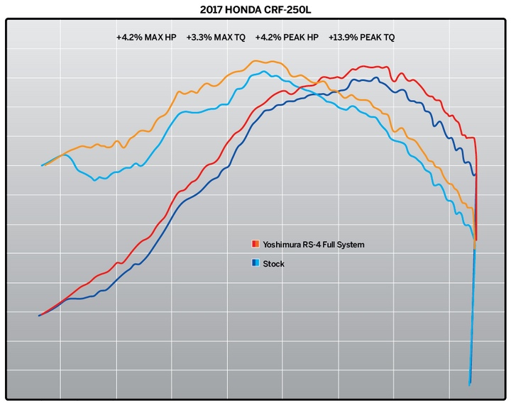 Now Yoshimura introduces the RS-4 Race Series full system for the new dual sport machine. By giving the new CRF250L more power and torque, the RS-4 provides more punch at bottom end with out sacrificing the mid and top power. The new system also removes a good amount of weight from the stock unit. Those that love the Yoshimura RS-4 sound will love the way it makes the new CRF250L Rally sing!