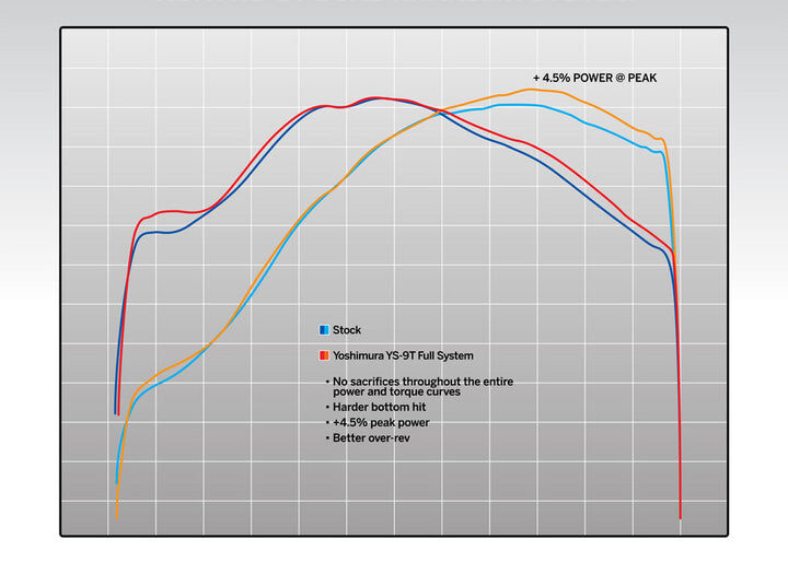 Yoshimura has been working tirelessly on development with American Honda HRC's engineers to achieve maximum performance and mass centralization, to optimize rider usability. Yoshimura achieved all this by moving the new RS-9T mufflers forward in order to tuck in under the side number plates. Working with HRC race engineers and the all-new 449cc Unicam engine and its unique downdraft fuel injection system, Yoshimura was able to deliver an exhaust that provides more tractable power and improved torque.