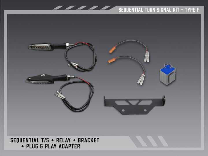 Sequential lights offer movement so other riders and drivers can possibly see you better. Our Sequential Signal kit for V2 FE kits include Yoshimura signals, with OEM plug wiring adapters and an intelligently designed, powder coated, stainless steel mounting bracket. All necessary components for true plug-and-play function are also included if your bike model requires it.