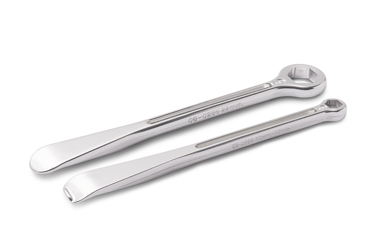 • One lever has unique combination stepped 10/12 mm box end wrench on other end for turning rim lock nuts